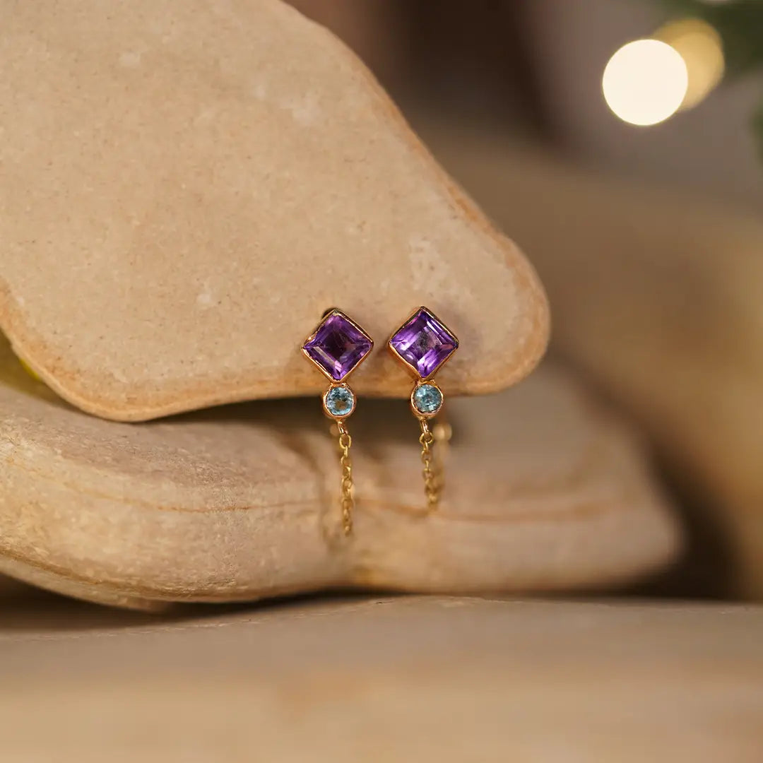 These traceable 18k gold earrings feature a captivating design that plays with geometry and brilliance. The centerpiece is a cube-cut amethyst, whose deep purple hue symbolizes intuition and tranquility. Beneath it, a delicate topaz adds a touch of clarity, culminating in a fine gold chain that lends an elegant and modern movement.