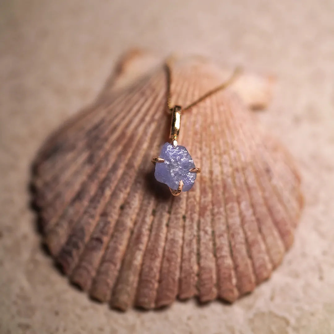Discover the mystique of one of the world's rarest gemstones. This 18K gold pendant celebrates pure beauty with a raw Tanzanite , selected for its deep lavender hue and organic texture. By remaining in its natural state, each pendant tells a different geological story, creating a piece of fine jewelry as unique as the person who wears it.