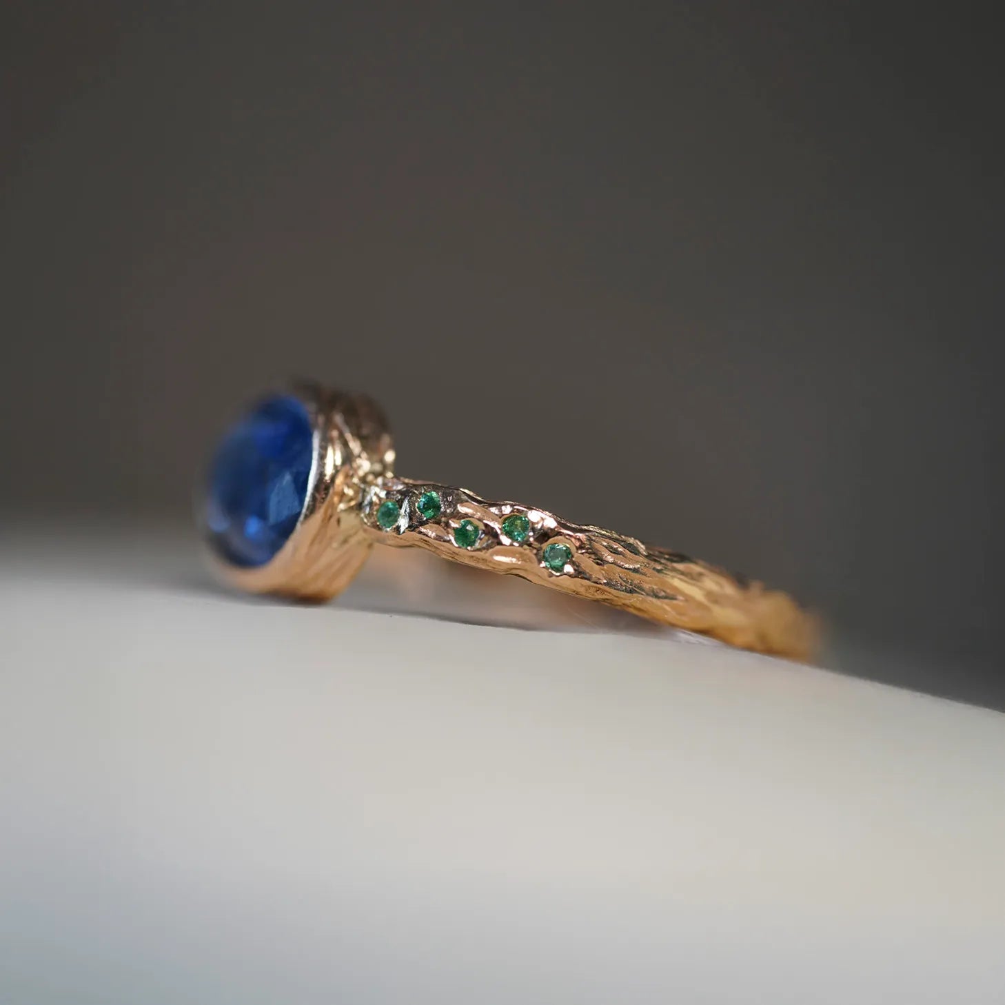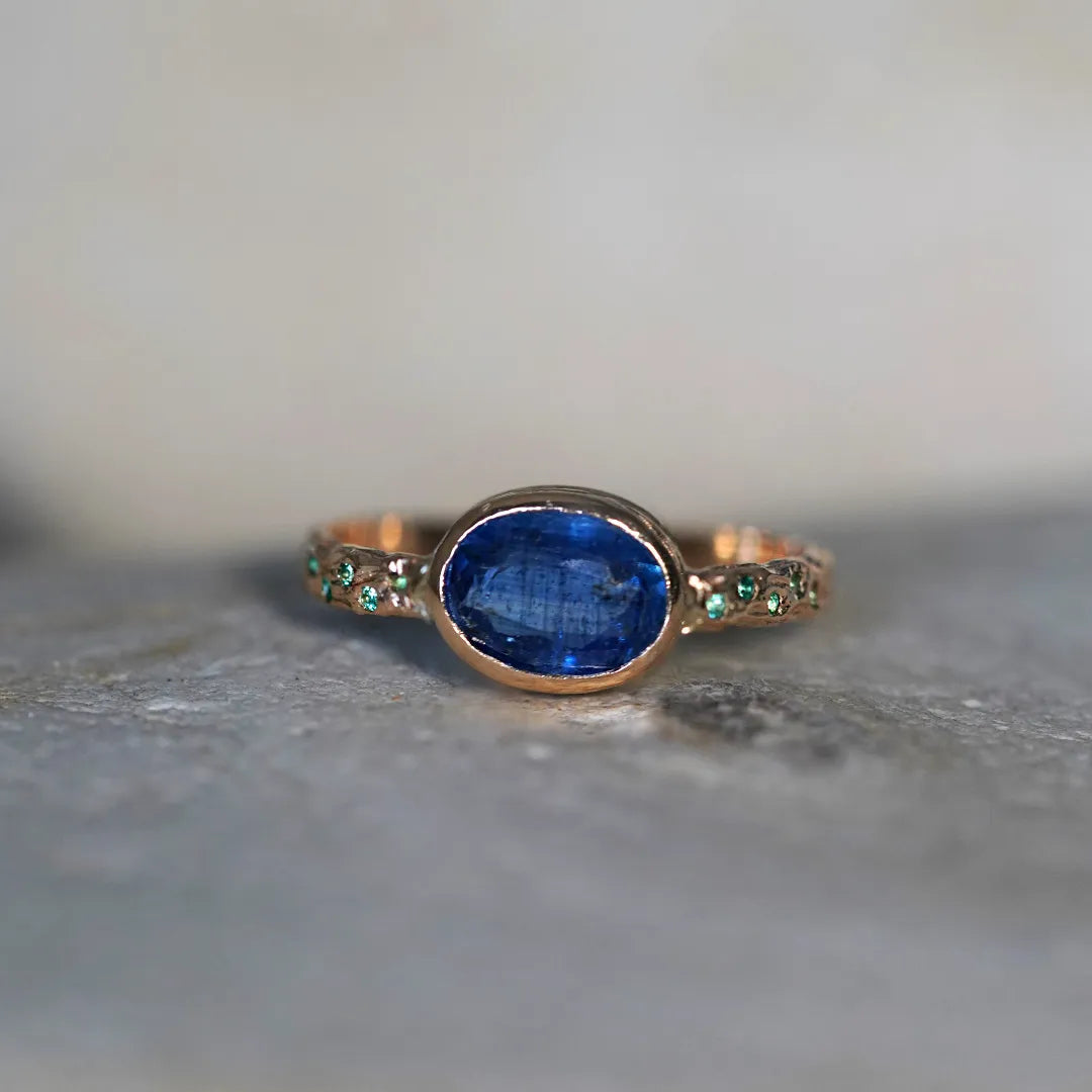 Indie Gold Ring with Kyanite and Emeralds, handcrafted in 18k gold.