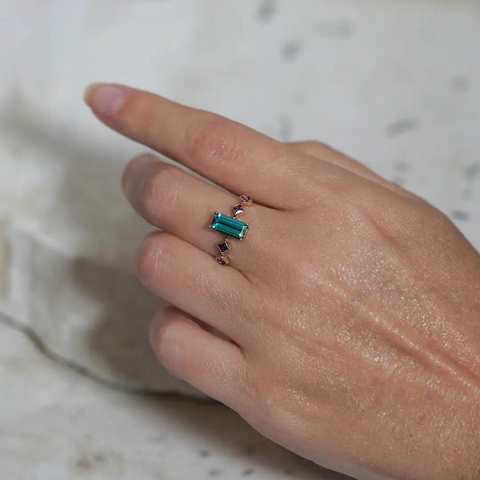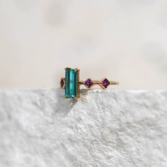 Rhombus Gold Ring with Rhodolite and Tanzanites, handcrafted in 18k gold. At the center, a Rhodolite...