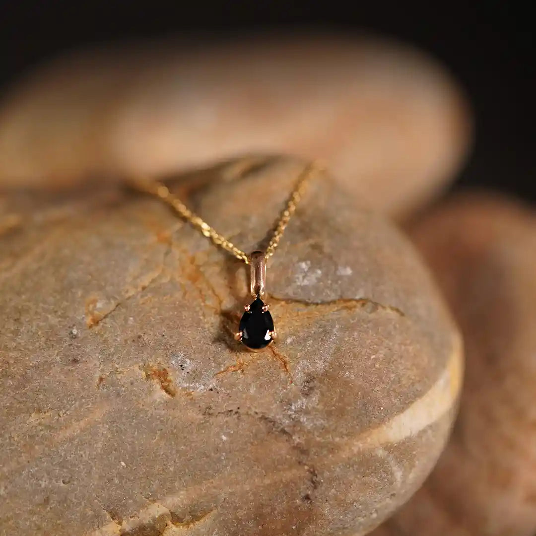 Este Dije en Oro de 18k trazable es una pieza que personifica la elegancia sobria y el misterio. El diseño destaca por una Ónix negro en un impecable corte gota, una gema que no solo cautiva por su brillo profundo y oscuro, sino por su potente simbolismo.
