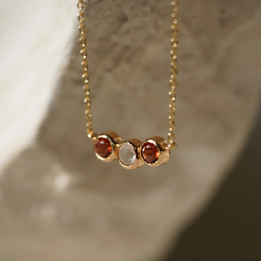El Collar Friendship ha sido cuidadosamente hecho a mano en oro ético de 18k, combinando el Cuarzo, símbolo de energía positiva, con el Granate, piedra del amor, la pasión y la conexión entre personas.