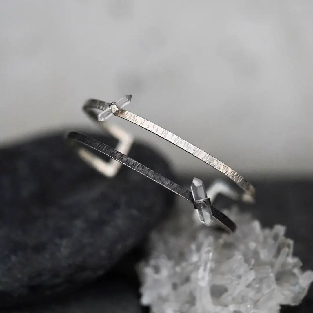 Brazalete doble de plata con Cuarzos naturales y acabados contrastantes. Una pieza que canaliza energía y equilibrio. Hecho a mano en Perú.