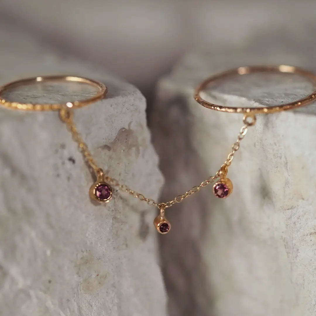 La cadena incorpora tres Rodolitas de un hermoso color magenta, cuidadosamente engastadas a mano por artesanos joyeros. La disposición de las gemas crea un efecto visual único y sofisticado al llevarlo puesto.